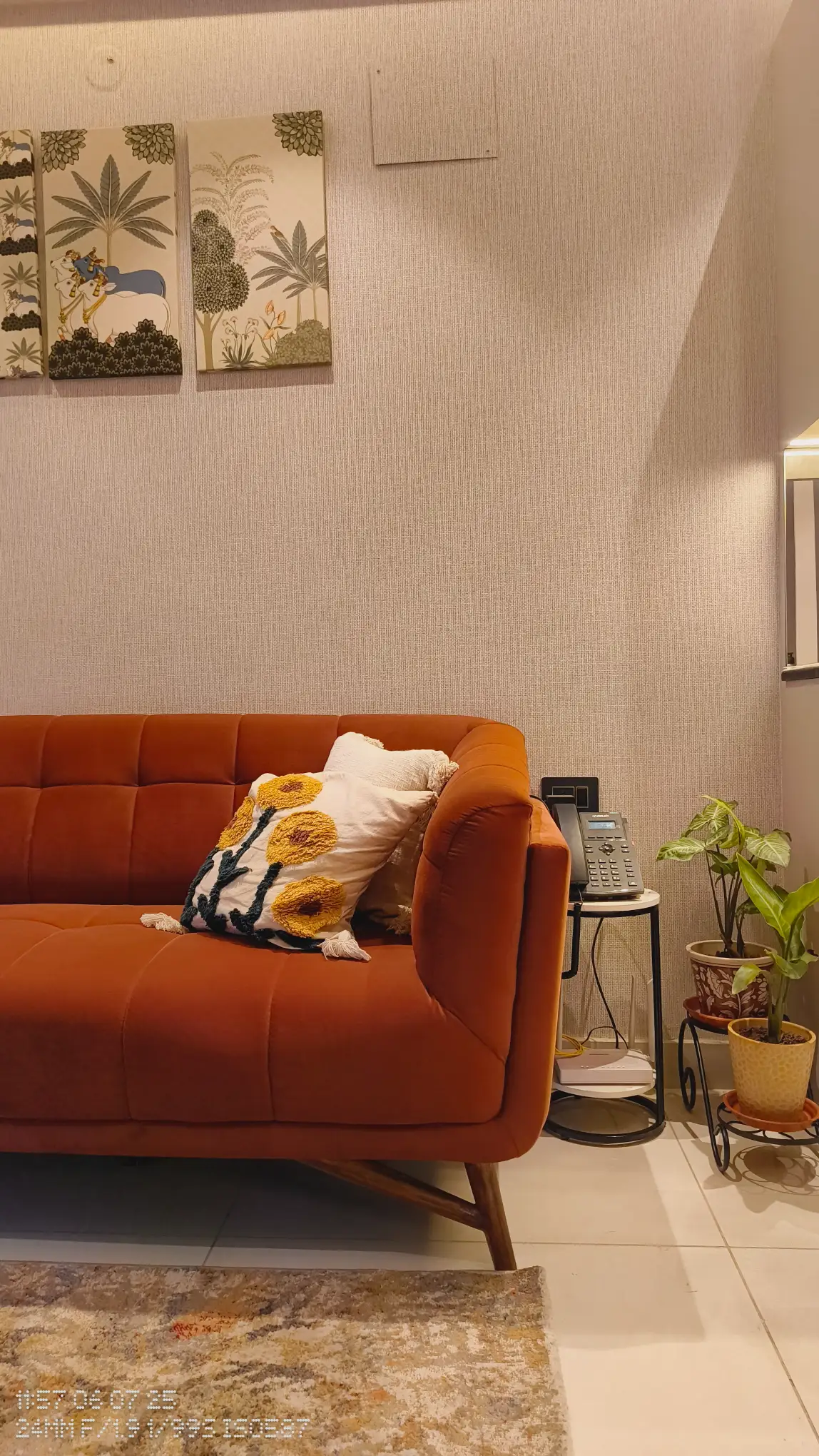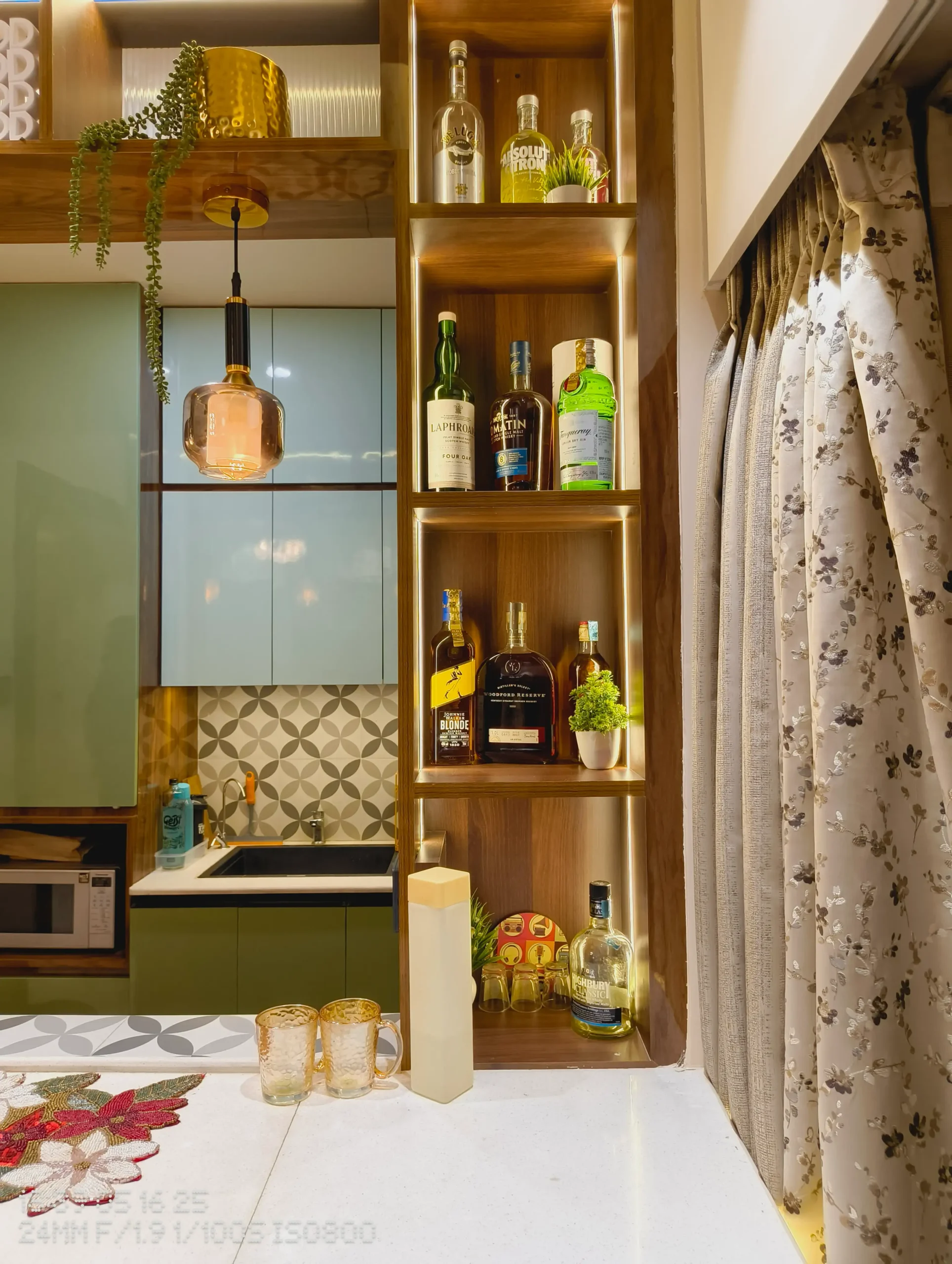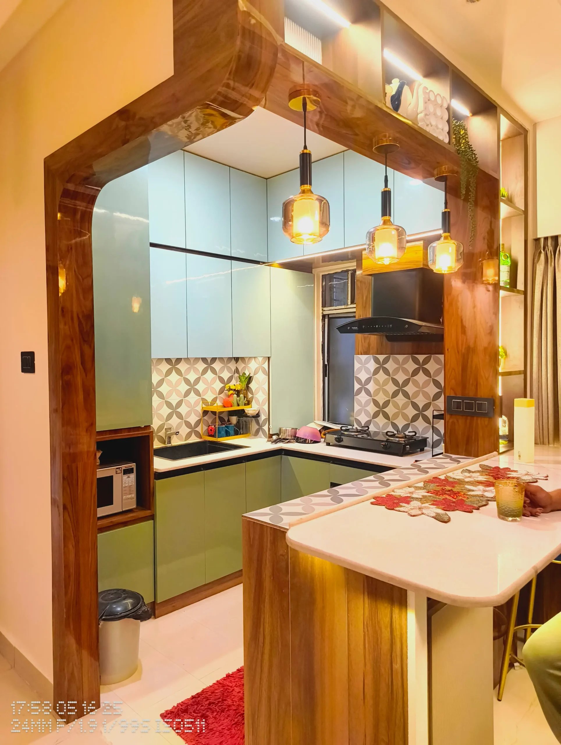 a boho apartment with bright green kitchen, moroccan tiles, mystical sofa backdrop. a hidden window behind the master bed.